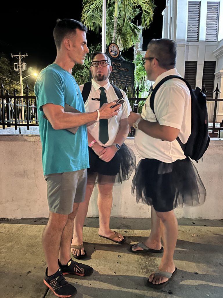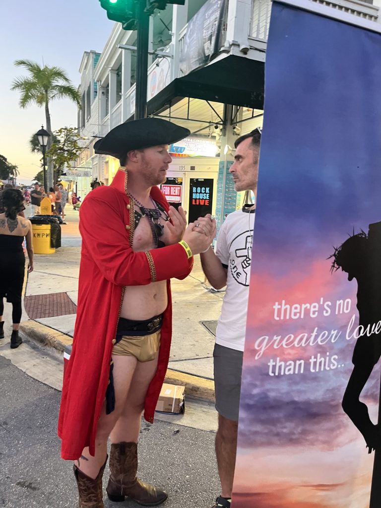 The only serious pushback we got was from these two guys. They are “elders” at a gay affirming Episcopal church on Duval Street, where we had set up. They are in a gay relationship, and once that came out, they argued with us, called us names and made some threats against us. Thankfully though, during the interaction they heard ALOT of Truth about their sin. After seeing them on night one, we never saw them again, even though we set up near the same spot the next two nights. I have to believe that God brought conviction.