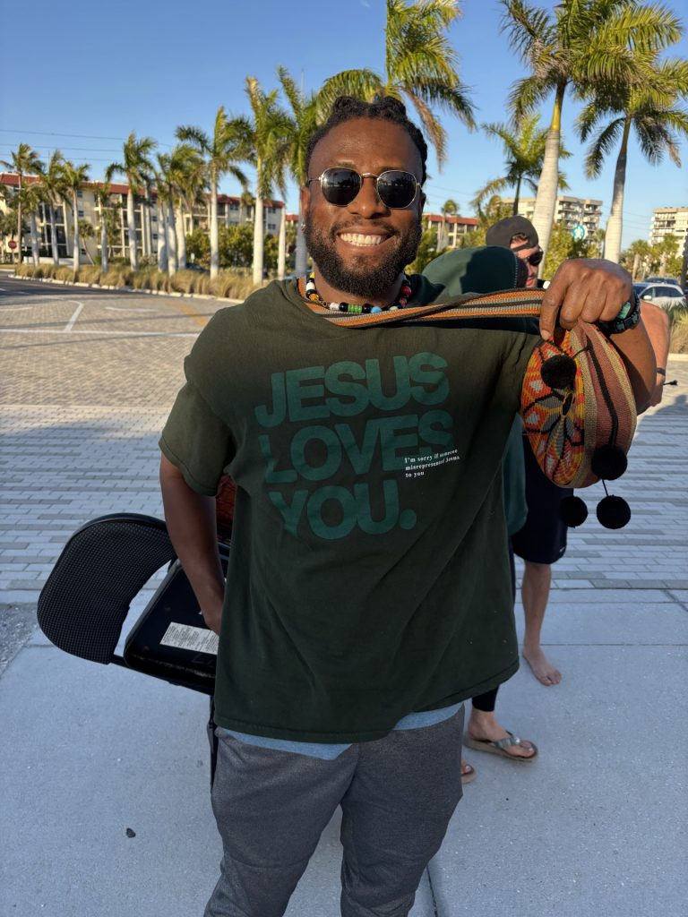 His name is Luke and back in the day he was one who was somewhat antagonistic to us. One time, he even very rudely instigated several of the drummers drumming over us in the pavilion after the regular circle was over. He got much more friendly with us a few years ago, but never once has he mentioned to us that he was seeking Jesus. When I saw the shirt, I told him “I’ve gotta take a picture of this!” He then told me that he’s been going to church regularly!